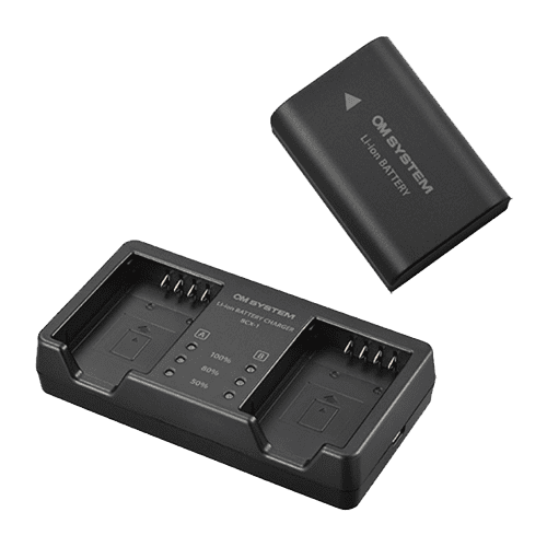 The SBCX-1 Lithium-Ion Battery and Charger Kit includes one BLX-1 Lithium-Ion Battery and recharges one or two BLX-1 batteries at the same time.